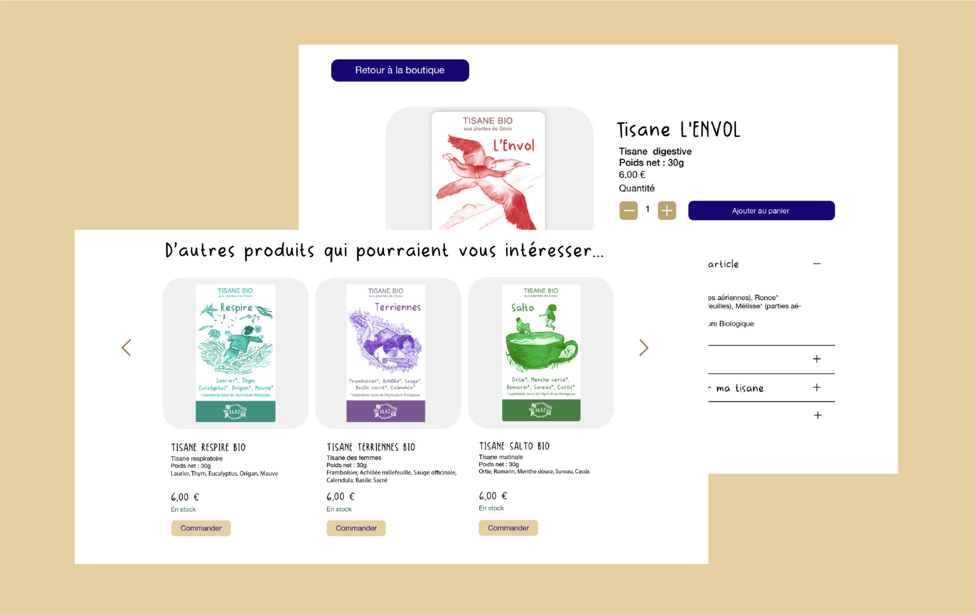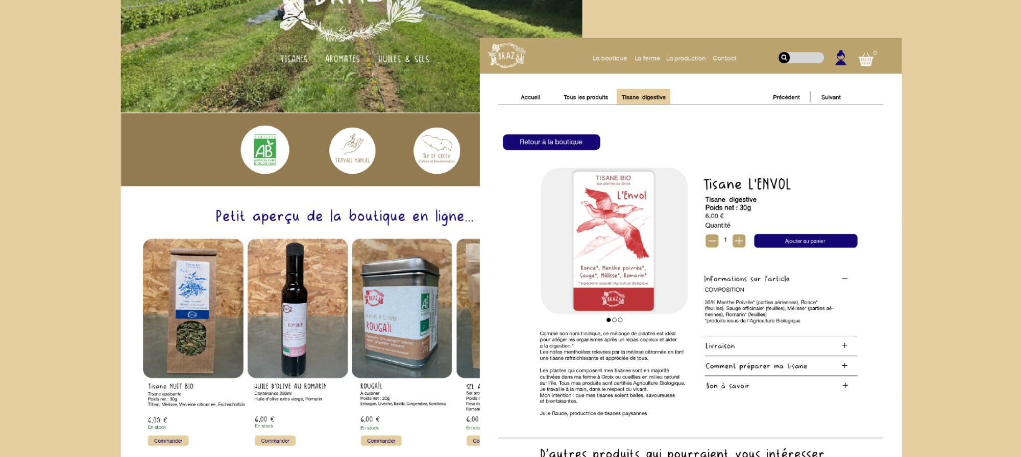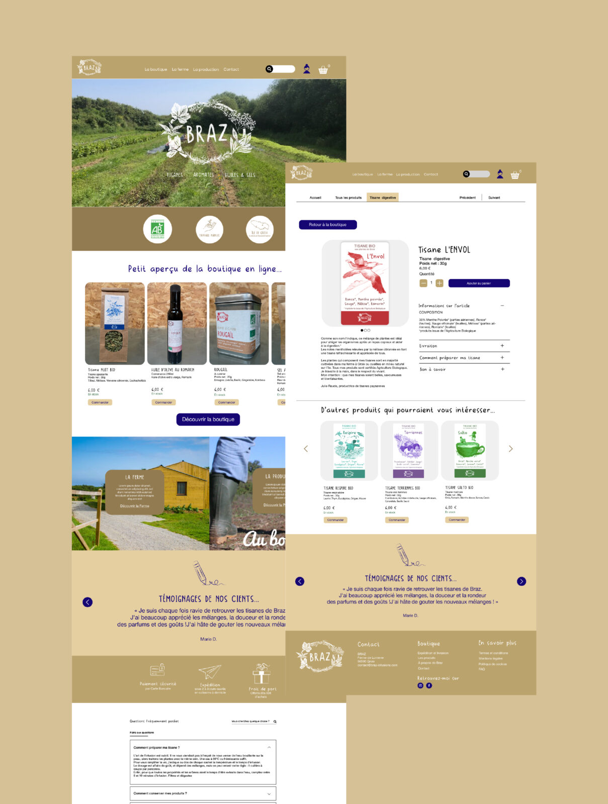 BRAZ INFUSIONS Retour au portfolioCliente : Justine R. – Agricultrice Découvrir le site internet Livrables :PictogrammesMaquettes site Site internet E-commerceL’histoire du projet : PROJET GRAPHIQUE Le prochain, c’est le tien ?Une marque ou une entreprise est bien plus qu’un logo ! C’est tout une histoire, un vécu à raconter. Réserver mon projet